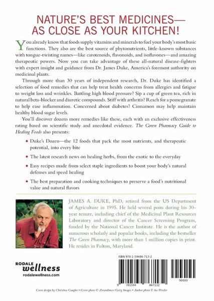 Upon its publication more than a decade ago, Dr. James Duke's The Green Pharmacy quickly set the standard for consumer herb references. A favorite of laypeople and professionals alike, the book sold more than a million copies and solidified the author's reputation as one of the world's foremost authorities on medicinal plants. In The Green Pharmacy Guide to Healing Foods, Dr. Duke turns to the broader and even more popular subject of food as medicine, drawing on more than thirty years of research to identify the most powerful healing foods on earth. Whether he is revealing how to beat high cholesterol with blueberries, combat hot flashes with black beans, bash blood sugar spikes with almonds, or help relieve agonizing back pain with pineapple, Dr. Duke's food remedies help treat and prevent the whole gamut of health concerns, from minor (such as sunburn and the common cold) to more serious (like arthritis and diabetes). Dr. Duke has assigned a rating to each remedy, according to his evaluation of the available scientific studies and anecdotal reports. Many of the healing foods recommended here are proving so effective that they may outperform popular pharmaceuticals-minus the risk (and cost).