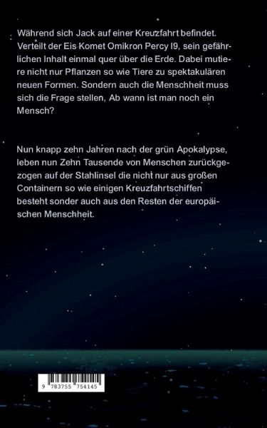 Während sich Jack auf einer Kreuzfahrt befindet. Verteilt der Eis Komet Omikron Percy I9, sein gefährlichen Inhalt einmal quer über die Erde. Dabei mutiere nicht nur Pflanzen so wie Tiere zu spektakulären neuen Formen. Sondern auch die Menschheit muss sich die Frage stellen:Ab wann ist man noch ein Mensch ?Nun knapp zehn Jahren nach der grün Apokalypse, leben nun Zehn Tausende von Menschen zurückgezogen auf der Stahlinsel die nicht nur aus großen Containern so wie einigen Kreuzfahrtschiffen besteht sonder auch aus den Resten der europäischen Menschheit.