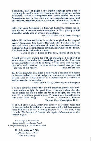 The Hill and Wang Critical Issues Series: concise, affordable works on pivotal topics in American history, society, and politics. The Green Revolution documents the tremendous change in public awareness and attitudes since the publication of Rachel Carson's Silent Spring. Sale assesses the growth of national environmental organizations and the influence of scientists and their theories about global warming, the greenhouse effect, acid rain, toxic waste, and biodiversity. And he shows how environmental concerns affect all levels of society and much of our government's legislative and regulatory work.