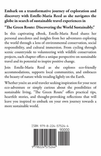 Embark on a transformative journey of exploration and discovery with Estelle-Maria Reed as she navigates the globe in search of sustainable travel experiences in "The Green Route: Discovering the World Sustainably." In this captivating eBook, Estelle-Maria Reed shares her personal anecdotes and insights from her adventures exploring the world through a lens of environmental conservation, social responsibility, and cultural immersion. From cycling through scenic countryside to volunteering with wildlife conservation projects, each chapter offers a unique perspective on sustainable travel and its potential to inspire positive change. Join Estelle-Maria Reed as she explores eco-friendly accommodations, supports local communities, and embraces the beauty of nature while treading lightly on the Earth. Whether you're an avid traveler seeking inspiration for your next eco-adventure or simply curious about the possibilities of sustainable living, "The Green Route" offers practical tips, heartfelt stories, and thought-provoking reflections that will leave you inspired to embark on your own journey towards a more sustainable world.