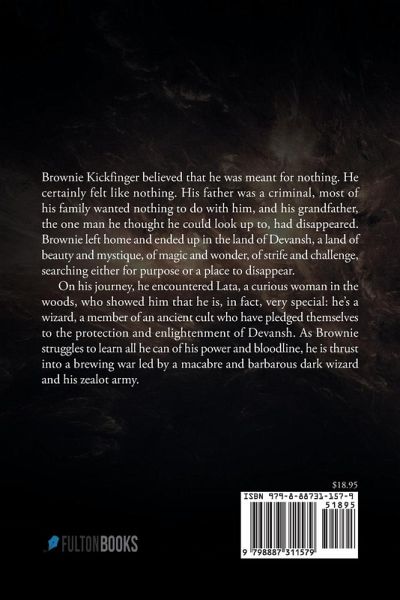 Brownie Kickfinger believed that he was meant for nothing. He certainly felt like nothing. His father was a criminal, most of his family wanted nothing to do with him, and his grandfather, the one man he thought he could look up to, had disappeared. Brownie left home and ended up in the land of Devansh, a land of beauty and mystique, of magic and wonder, of strife and challenge, searching either for purpose or a place to disappear. On his journey, he encountered Lata, a curious woman in the woods, who showed him that he is, in fact, very special: he's a wizard, a member of an ancient cult who have pledged themselves to the protection and enlightenment of Devansh. As Brownie struggles to learn all he can of his power and bloodline, he is thrust into a brewing war led by a macabre and barbarous dark wizard and his zealot army.