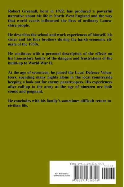 Robert Greenall, born in 1922, has produced a powerful narrative about his life in North West England and the way that world events influenced the lives of ordinary Lancashire people. He describes the school and work experiences of himself, his sister and his four brothers during the harsh economic climate of the 1930s. He continues with a personal description of the effects on his Lancashire family of the dangers and frustrations of the build-up to World War II. At the age of seventeen, he joined the Local Defence Volunteers, spending many nights alone in the local countryside keeping a look-out for enemy paratroopers. His experiences after call-up to the army at the age of nineteen are both comic and poignant. He concludes with his family's sometimes difficult return to civilian life.