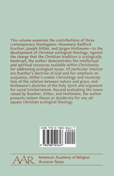 This volume examines the contributions of three contemporary theologians -- Rosemary Radford Ruether, Joseph Sittler, and Jürgen Moltmann -- to the development of Christian ecological theology. Against the charge that the Christian tradition is ecologically bankrupt, the author demonstrates the intellectual and spiritual resources available within Christianity for addressing ecological issues. Of particular interest are Ruether's doctrine of God and her emphasis on ecojustice, Sittler's cosmic Christology and reconception of the relation between nature and grace, and Motlmann's doctrine of the Holy Spirit and argument for social trinitarianism. Beyond evaluating the issues raised by Ruether, Sittler, and Moltmann, the author presents sixteen theses or desiderata for any adequate Christian ecological theology.