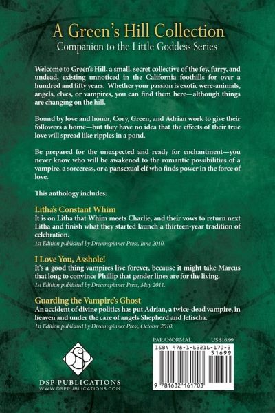 A Green's Hill CollectionCompanion to the Little Goddess Series Welcome to Green's Hill, a small, secret collective of the fey, furry, and undead, existing unnoticed in the California foothills for over a hundred and fifty years. Whether your passion is exotic were-animals, angels, elves, or vampires, you can find them here-although things are changing on the hill. Bound by love and honor, Cory, Green, and Adrian work to give their followers a home-but they have no idea that the effects of their true love will spread like ripples in a pond. Be prepared for the unexpected, and ready for enchantment-you never know who will be awakened to the romantic possibilities of a vampire, a sorceress, or a pansexual elf who finds power in the force of love. This anthology includes: Litha's Constant Whim It is on Litha that Whim meets Charlie, and their vows to return next Litha and finish what they started launch a thirteen-year tradition of celebration. First Edition published by Dreamspinner Press, June 2010. I Love You, Asshole! It's a good thing vampires live forever, because it might take Marcus that long to convince Phillip that gender lines are for the living. First Edition published by Dreamspinner Press, May 2011. Guarding the Vampire's Ghost An accident of divine politics has put Adrian, a twice-dead vampire, in heaven and under the care of angels Shepherd and Jefischa. First Edition published by Dreamspinner Press, October 2010.