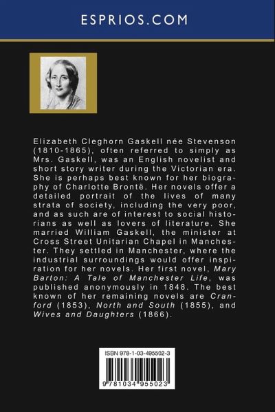 Elizabeth Cleghorn Gaskell née Stevenson (1810-1865), often referred to simply as Mrs. Gaskell, was an English novelist and short story writer during the Victorian era. She is perhaps best known for her biography of Charlotte Brontë. Her novels offer a detailed portrait of the lives of many strata of society, including the very poor, and as such are of interest to social historians as well as lovers of literature. She married William Gaskell, the minister at Cross Street Unitarian Chapel in Manchester. They settled in Manchester, where the industrial surroundings would offer inspiration for her novels. Her first novel, Mary Barton: A Tale of Manchester Life, was published anonymously in 1848. The best known of her remaining novels are Cranford (1853), North and South (1855), and Wives and Daughters (1866).