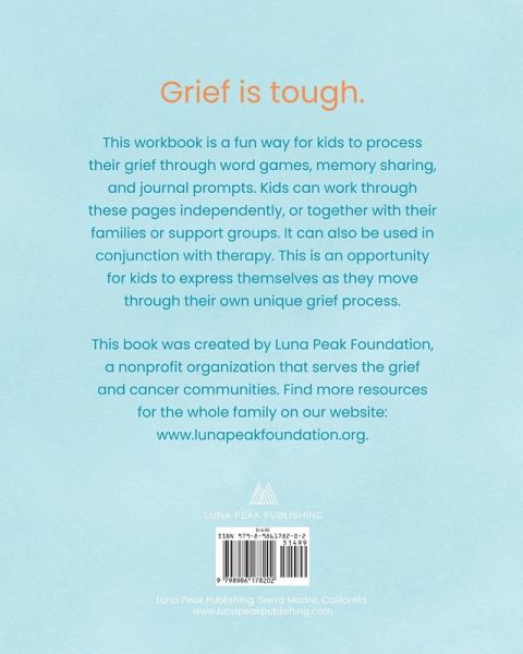 The Grief Workbook for Kids is a fun way to unpack a serious experience: grief. It has something for every child - humor, word games, opportunities to share memories of your loved one(s), and reflective prompts. This workbook can be used as a resource for individual reflection, for families to fill out and share about a mutual loss, for grief support groups, or for grievers to share with their supporters to shed some light on their grief process. It can also be used in correlation with therapy and for educating on grief. This book was created by Luna Peak Foundation, a 501(c)(3) nonprofit organization that serves the grief and cancer communities. Find more resources for your family at www.lunapeakfoundation.org. Publishing website: www.lunapeakpublishing.com
