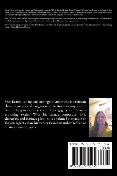 "The Grinning Menace: Tales of Demonic Clowns" is a collection of ten bone-chilling horror stories that will leave you trembling with fear. Step right up and enter the twisted world of demonic clowns, where the lines between reality and nightmare blur, and the laughter turns into screams. From the dark corners of a forgotten carnival to the depths of a sinister circus, each story in this collection features a unique and terrifying tale of demonic clowns that will haunt your dreams long after you've turned the final page. Meet the Jester's Curse, witness the revenge of a clown wronged, and experience the chilling terror of the Grinning Menace's return. With a masterful blend of suspense, horror, and gore, "The Grinning Menace: Tales of Demonic Clowns" is a must-read for fans of horror and the supernatural. Dare to enter the world of the demonic clown and see if you have what it takes to survive the nightmare.