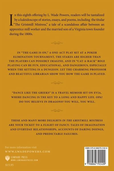 In this eighth offering by L. Wade Powers, readers will be tantalized by a kaleidoscope of stories, essays, and poems, including the titular "The Gristmill Mistress," a tale of a scandalous affair between an apprentice mill worker and the married son of a Virginia town founder during the 1800s. In "The Game is On," a one-act play set at a poker elimination tournament, the stakes are higher than the players can possibly imagine, and in "Cat-a-Rack" role playing can be fun, educational, and dangerous, especially when the setting is a dungeon. Let the charming professor and beautiful librarian show you how the game is played. "Dance Like the Greeks" is a travel memoir set on Evia, where dancing is the key to a long and happy life. Opa! Do you believe in dragons? You will, you will. These and many more delights in The Gristmill Mistress are your ticket to a flight of fancy: tales of imagination and everyday relationships, accounts of daring doings, and predictable failures.