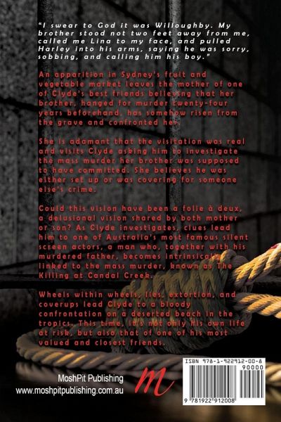 "I swear to God it was Willoughby. My brother stood not two feet away from me, called me Lina to my face, and pulled Harley into his arms, saying he was sorry, sobbing, and calling him his boy." An apparition in Sydney's fruit and vegetable market leaves the mother of one of Clyde's best friends believing that her brother, hanged for murder twenty-four years beforehand, has somehow risen from the grave and confronted her. She is adamant that the visitation was real and visits Clyde asking him to investigate the mass murder her brother was supposed to have committed. She believes he was either set up or was covering for someone else's crime. Could this vision have been a folie à deux, a delusional vision shared by both mother or son? As Clyde investigates, clues lead him to one of Australia's most famous silent screen actors, a man who, together with his murdered father, becomes intrinsically linked to the mass murder, known as The Killing at Candal Creek. Wheels within wheels, lies, extortion, and coverups lead Clyde to a bloody confrontation on a deserted beach in the tropics. This time, it's not only his own life at risk but also that of one of his most valued and closest friends.