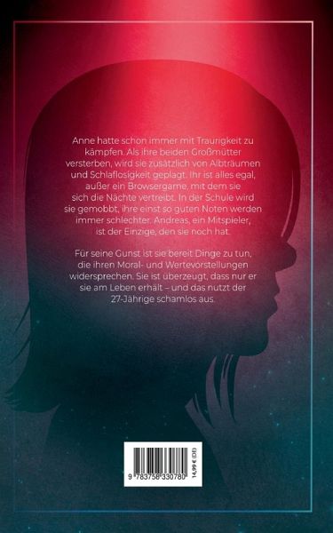 Anne hatte schon immer mit Traurigkeit zu kämpfen. Als ihre beiden Großmütter versterben, wird sie zusätzlich von Albträumen und Schlaflosigkeit geplagt. Ihr ist alles egal, außer ein Browsergame, mit dem sie sich die Nächte vertreibt. In der Schule wird sie gemobbt, ihre einst so guten Noten werden immer schlechter. Andreas, ein Mitspieler, ist der Einzige, den sie noch hat.Für seine Gunst ist sie bereit Dinge zu tun, die ihren Moral- und Wertevorstellungen widersprechen. Sie ist überzeugt, dass nur er sie am Leben erhält - und das nutzt der 27-Jährige schamlos aus.(Bitte die Triggerwarnungen und Content Notes im Buch beachten.)