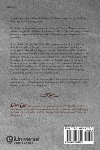 A medicine woman will mend the birdmans broken wings, but take heed, my lovely, for he is a brooding angel. So whispers a famous clairvoyant to neuroscientist Aimee Moreau, a woman who is not typically a follower of paranormal beliefs. This riddle propels Aimee on an amazing journey of discovery that will soon uncover deep secrets about her mother. A few months after her visit to the clairvoyant, Aimee learns her mother is dead. In the midst of her grief, she finds a cryptic note concealed inside a rosary pouch. Aimee slowly begins to interpret clues that reveal her mothers double life, which included a clandestine relationship with a Jesuit priest. As she learns, she embarks on a mission to discover more. When Aimee arrives at the hermitage of the reclusive clericcalled the Brooding Angel by her mothershe is swept into a world of mysticism, magic, and paranormal seduction. Shocked by her findings and fueled by maternal loyalty, Aimee flees to her ancestral homeland, where she must join forces with her mothers beguiling companion to decipher a powerful spiritual riddle. As Aimee finally unravels her mothers web of illusions, she uncovers something so sinisterso spellbindingthat it shatters not only everything she has ever believed in, but also everything she is.