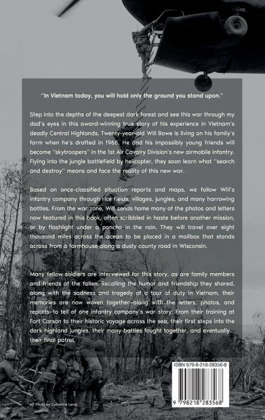 "In Vietnam today, you will hold only the ground you stand upon." Step into the depths of the deepest dark forest and see this war through my dad's eyes in this award-winning true story of his experience in Vietnam's deadly Central Highlands. Twenty-year-old Will Bowe is living on his family's farm when he's drafted in 1965. He and his impossibly young friends will become "skytroopers" in the 1st Air Cavalry Division's new airmobile infantry. Flying into the jungle battlefield by helicopter, they soon learn what "search and destroy" means and face the reality of this new war. Based on once-classified staff journals, situation reports, and military maps, we follow Alpha Company, 5th Battalion, 7th Cavalry as they march through rice fields, search villages, climb jungle-covered mountains, and endure many harrowing battles. From the war zone, Will sends home many of the photographs and letters now featured in this book, often scribbled in haste before another mission, or by flashlight under a poncho in the rain. They will travel over eight thousand miles across the ocean to be placed in a mailbox that stands across from a farmhouse along a dusty county road in Wisconsin. Many fellow soldiers are interviewed for this story, as are family members and friends of the fallen. Recalling the humor and friendship they shared, along with the sadness and tragedy of a tour of duty in Vietnam, their memories are now woven together, along with the letters, photos, and reports, to tell of one infantry company's war story: From their training at Fort Carson to their historic voyage across the sea, their first steps into the dark highland jungles, their many battles fought together, and eventually... their final patrol.