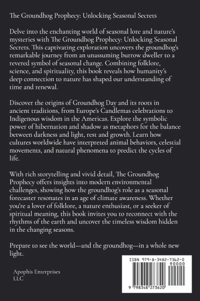 The Groundhog Prophecy: Unlocking Seasonal Secrets Delve into the enchanting world of seasonal lore and nature's mysteries with The Groundhog Prophecy: Unlocking Seasonal Secrets. This captivating exploration uncovers the groundhog's remarkable journey from an unassuming burrow dweller to a revered symbol of seasonal change. Combining folklore, science, and spirituality, this book reveals how humanity's deep connection to nature has shaped our understanding of time and renewal. Discover the origins of Groundhog Day and its roots in ancient traditions, from Europe's Candlemas celebrations to Indigenous wisdom in the Americas. Explore the symbolic power of hibernation and shadow as metaphors for the balance between darkness and light, rest and growth. Learn how cultures worldwide have interpreted animal behaviors, celestial movements, and natural phenomena to predict the cycles of life. With rich storytelling and vivid detail, The Groundhog Prophecy offers insights into modern environmental challenges, showing how the groundhog's role as a seasonal forecaster resonates in an age of climate awareness. Whether you're a lover of folklore, a nature enthusiast, or a seeker of spiritual meaning, this book invites you to reconnect with the rhythms of the earth and uncover the timeless wisdom hidden in the changing seasons. Prepare to see the world-and the groundhog-in a whole new light.