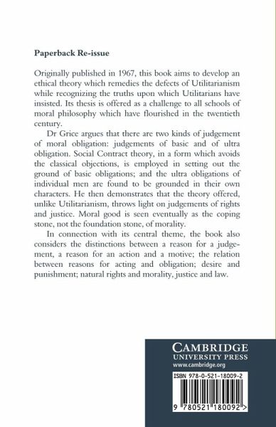 Originally published in 1967, this book aims to develop an ethical theory which remedies the defects of Utilitarianism while recognising the truths upon which Utilitarians have insisted. Its thesis is offered as a challenge to all schools of moral philosophy which have flourished in the twentieth century. Dr Grice argues that there are two kinds of Judgement of moral obligation. Social Contract theory, in a form which avoids the classical objections, is employed in setting out the ground of basic obligations; and the ultra obligations of individual men are found to be grounded in their own characters. He then demonstrates that the theory offered, unlike Utilitarianism, throws light on judgements of rights and justice. Moral good is seen eventually as the coping stone, not the foundation stone of morality.