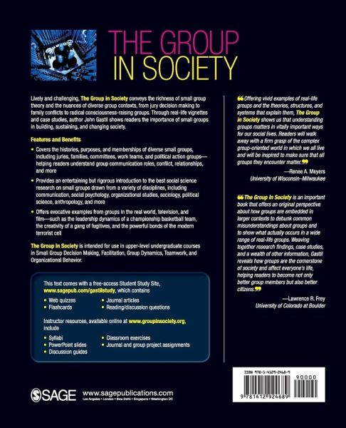 The Group in Society meets the challenges of teaching courses on small groups by revealing the full complexity of small groups and their place in society. It shows students the value of learning how to carefully study a group's history and context, rather than merely learning a fixed set of group participation skills. This text brings together disparate theories and research (from communication, social psychology, organizational and managerial studies, and sociology) in a way that helps students make sense of a complex body of scholarship on groups. Features & Benefits Part I – Theorizing Groups: builds a strong theoretical foundation, exploring social theory and the group, forming and joining groups, the life and death of the group, and changing society through group life Part II – Understanding Groups in Context: explores the histories, purposes, memberships of a variety of groups—including juries, families, executive committees, study groups, and political action groups—thus enabling the student reader to speak clearly about group formation, norms, roles, tasks, and relationships. Detailed end-of-chapter case studies explicitly connect with the concepts, theories, and empirical findings introduced in each respective chapter; examples include the powerful group bonds of the modern terrorist cell; the wired network of groups in the anti-Globalization movement; and the deliberation of a jury in a murder trial Teaching & Learning Ancillaries Teaching resources are available at http://groupinsociety.la.psu.edu/ and include chapter summaries, discussion questions, and practical applications; a sample course schedule; Embedded Systems Framework PowerPoint slides; group project assignments, group project worksheets, and a group project description and contract; and links to useful Web resources such as small group teaching resources and active wikis on small groups. An open-access student study site at www.sagepub.com/gastilstudy features e-flashcards, practice quizzes, and other resources to help students enhance their comprehension and improve their grade.