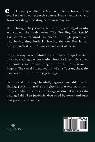 Cody Hunter patrolled the Mexico border by horseback in southern Arizona's expansive desert. He was ambushed and flown to a dangerous drug cartel near Bogota. While being held prisoner, he heard big cats caged nearby and dubbed the headquarters "The Growling Cat Ranch" This cartel entertained its friends in high places and neighboring drug lords by feeding the cats live human beings, preferably U. S. law enforcement officers. Cody, having never piloted an airplane, escaped certain death by stealing one but crashed into the forest. He eluded his hunters and found refuge at the D.E.A. station in Bogota. ¿The cartel kidnapped his wife in Tucson, then, she too, was destined for the jaguar cages. He rescued her singlehandedly against incredible odds. Having proven himself as a fighter and expert marksman, Cody is inducted into a secret organization that evens the playing field when justice is obstructed by power and rules that prevent convictions.