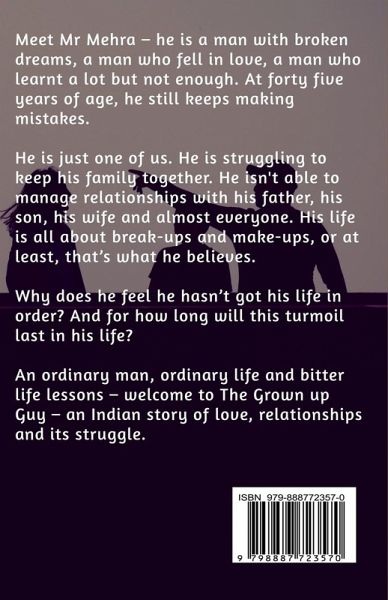 Meet Mr Mehra - he is a man with broken dreams, a man who fell in love, a man who learnt a lot but not enough. At forty five years of age, he still keeps making mistakes and wouldn't call himself a success. He is just one of us. He is struggling to keep his family together. He isn't able to manage relationships with his father, his son, his wife and almost everyone. His life is all about break-ups and make-ups, or at least, that's what he believes. Why does he feel he hasn't got his life in order? And for how long will this turmoil last in his life? An ordinary man, ordinary life and bitter life lessons - welcome to The Grown up Guy - an Indian story of love, relationships and its struggle.