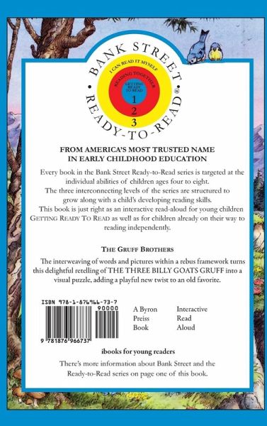 The interweaving of words and pictures within a rebus framework turns this delightful retelling of THE THREE BILLY GOATS GRUFF into a visual puzzle, adding a playful new twist to an old favorite. FROM AMERICA'S MOST TRUSTED NAME IN EARLY CHILDHOOD EDUCATION More than seventy years of educational research and innovative teaching have given the Bank Street College of Education the reputation as America's most trusted name in early childhood education. Because no two children are exactly alike in their development, we have designed the Bank Street Ready-to-Read series in three levels to accommodate the individual stages of reading readiness of children ages four through eight. • Level 1: GETTING READY TO READ- (PRE-K to GRADE 1) Books are perfect for reading aloud with children who are getting ready to read or are just beginning to read words or phrases. • Level 2: READING TOGETHER-(GRADES 1 to 3) Books are written especiallly for children who are on their way to reading independently but who may need help. • Level 3: I CAN READ IT MYSELF-(GRADES 2 to 3) Books are designed for children able to read on their own. They also can be enjoyed as read-alouds.