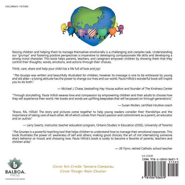 Raising children and helping them to manage themselves emotionally is a challenging and complex task. Understanding our "grumps" and fostering positive perspectives is imperative to developing compassionate life skills and developing a strong moral character. This book helps parents, teachers, and caregivers empower children by showing them that they control their thoughts, words, emotions, and actions through their choices. Think, care, share and help your child live a life full of love and joy! "The Grumps was written and beautifully illustrated for children, however its message is one to be embraced by young and old alike-a loving attitude has the power to change our lives and our world. Paula Hillick's wonderful book will inspire you to do both." - Michael J. Chase, bestselling Hay House author and founder of The Kindness Center "Through storytelling, Paula Hillick weaves love and compassion by empowering children and their adults to choose how they will experience their world. Her books and words are uplifting keepsakes that will be passed on through generations." - Susan Mullen, certified intuitive coach "Bravo, Ms. Hillick! The story and pictures come together to help young readers consider their friendships and the importance of taking care of each other. All of which comes from Paula's passion and commitment as a parent, an educator and an author." - Larry Swartz, instructor, teacher education program, Ontario Studies in Education (OSIE), University of Toronto "The Grumps is a powerful teaching tool that helps children to understand how to manage their emotional responses. This book illustrates the power of: awareness of self and others; making good choices; the art of not internalizing someone else's behavior or mood; and choosing love. Paula Hillick's book is surely to become a favorite of parents, teachers and children alike." - Jill Flynn, retired Catholic school teacher