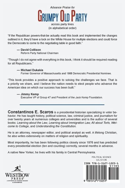 As a term of praise for having won the Civil War and having kept the nation together, the Republicans were dubbed the Grand Old Party or GOP. In their century-and-a-half of history, they elected more presidents than any other party. After losing the popular vote in the 2000 presidential election, eking out a tough win in 2004, and losing in 2008 and particularly in 2012 to an incumbent on whose watch a listless economy couldn't push unemployment much below 8 percent, the attitude of the Republican Party turned sour and negative. GOP might as well had stood for Grumpy Old Party. But all is not lost. In Grumpy Old Party, author Constantinos Scaros identifies 20 tips that will help the party move beyond recent losses, reclaim their respectability, and win. "If the Republican powers-that-be actually read this book and implemented the changes outlined in it, they'd have a lock on the White House for multiple elections and could force the Democrats to come to the negotiating table in good faith." - David Collison, Reform Party National Chairman "Though I do not agree with everything in this book, I think it should be required reading for all Republicans." - Michael Dukakis, Former Governor of Massachusetts and 1988 Democratic Presidential Nominee. "This book provides a positive approach to solving the challenges we face. That is a priority we share, and I believe the nation needs to elect people who advance the American idea on which our success has been built." - Jimmy Kemp, Executive VP of Group 47 and President of the Jack Kemp Foundation.