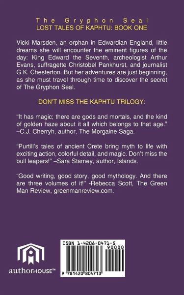Vicki Marsden, an orphan in Edwardian England, little dreams she will encounter the eminent figures of the day: King Edward the Seventh, archeologist Arthur Evans, suffragette Christobel Pankhurst, and journalist G.K. Chesterton. But her adventures are just beginning, as she must travel through time to discover the secret of The Gryphon Seal. DON'T MISS THE KAPHTU TRILOGY: "It has magic; there are gods and mortals, and the kind of golden haze about it all which belongs to that age." -C.J. Cherryh, author, The Morgaine Saga. "Purtill's tales of ancient Crete bring myth to life with exciting action, colorful detail, and magic. Don't miss the bull leapers!" -Sara Stamey, author, Islands. "Good writing, good story, good mythology. And there are three volumes of it!" -Rebecca Scott, The Green Man Review, greenmanreview.com.
