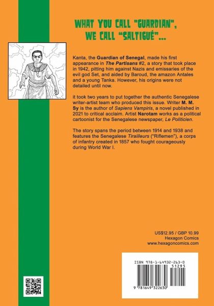 Kanta, the Guardian of Senegal, made his first appearance in The Partisans #2, a story that took place in 1942, pitting him against Nazis and emissaries of the evil god Set, and aided by Baroud, the amazon Antales and a young Tanka. However, his origins were not detailed until now. it took two years to put together the authentic Senegalese writer-artist team who produced this issue. Writer M. M. Sy is the author of Sapiens Vampiris, a novel published in 2021 to critical acclaim. Artist Narotam works as a political cartoonist for the Senegalese newspaper, Le Politicien. The story spans the period between 1914 and 1938 and features the Senegalese Tirailleurs ("Riflemen"), a corps of infantry created in 1857 who fought courageously during World War I.