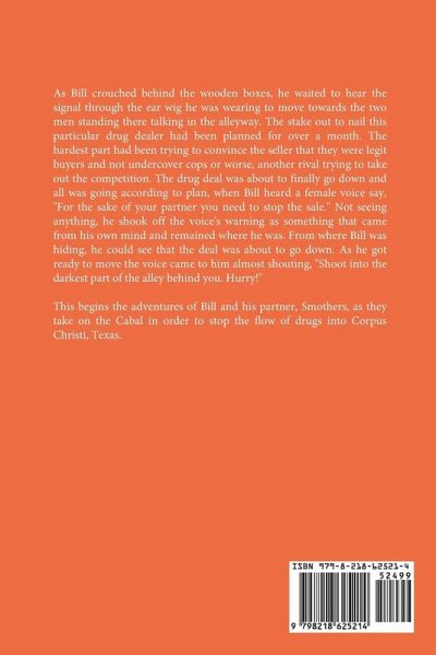 As Bill crouched behind the wooden boxes, he waited to hear the signal through the ear wig he was wearing to move towards the two men standing there talking in the alleyway. The stake out to nail this particular drug dealer had been planned for over a month. The hardest part had been trying to convince the seller that they were legit buyers and not undercover cops or worse, another rival trying to take out the competition. The drug deal was about to finally go down and all was going according to plan, when Bill heard a female voice say, "For the sake of your partner you need to stop the sale." Not seeing anything, he shook off the voice's warning as something that came from his own mind and remained where he was. From where Bill was hiding, he could see that the deal was about to go down. As he got ready to move the voice came to him almost shouting, "Shoot into the darkest part of the alley behind you. Hurry!" This begins the adventures of Bill and his partner, Smothers, as they take on the Cabal in order to stop the flow of drugs into Corpus Christi, Texas.