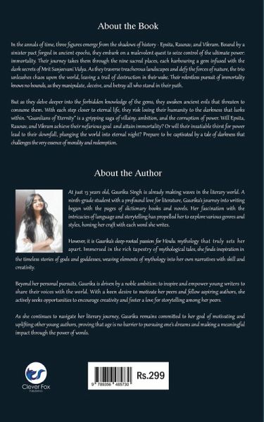 In the annals of time, three figures emerge from the shadows of history - Epsita, Raunav, and Vikram. Bound by a sinister pact forged in ancient epochs, they embark on a malevolent quest to seize control of the ultimate power: immortality. Their journey takes them through the nine sacred places, each harbouring a gem infused with the dark secrets of Mrit Sanjeevani Vidya. As they traverse treacherous landscapes and defy the forces of nature, the trio unleashes chaos upon the world, leaving a trail of destruction in their wake. Their relentless pursuit of immortality knows no bounds, as they manipulate, deceive, and betray all who stand in their path. But as they delve deeper into the forbidden knowledge of the gems, they awaken ancient evils that threaten to consume them. With each step closer to eternal life, they risk losing their humanity to the darkness that lurks within. "Guardians of Eternity" is a gripping saga of villainy, ambition, and the corruption of power. Will Epsita, Raunav, and Vikram achieve their nefarious goal and attain immortality? Or will their insatiable thirst for power lead to their downfall, plunging the world into eternal night? Prepare to be captivated by a tale of darkness that challenges the very essence of morality and redemption.