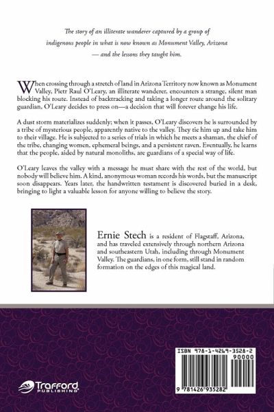 When crossing through a stretch of land in Arizona Territory now known as Monument Valley, Pietr Raul O'Leary, an illiterate wanderer, encounters a strange, silent man blocking his route. Instead of backtracking and taking a longer route around the solitary guardian, O'Leary decides to press on-a decision that will forever change his life. A dust storm materializes suddenly; when it passes, O'Leary discovers he is surrounded by a tribe of mysterious people, apparently native to the valley. They tie him up and take him to their village. He is subjected to a series of trials in which he meets a shaman, the chief of the tribe, changing women, ephemeral beings, and a persistent raven. Eventually, he learns that the people, aided by natural monoliths, are guardians of a special way of life. O'Leary leaves the valley with a message he must share with the rest of the world, but nobody will believe him. A kind, anonymous woman records his words, but the manuscript soon disappears. Years later, the handwritten testament is discovered buried in a desk, bringing to light a valuable lesson for anyone willing to believe the story.