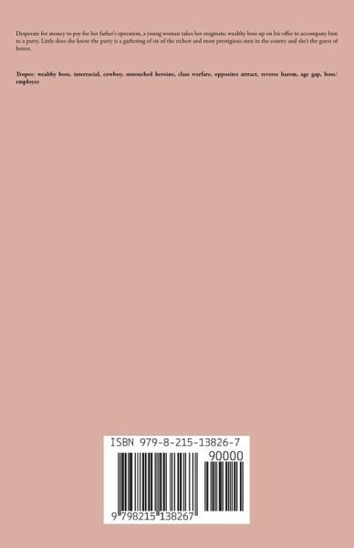 Desperate for money to pay for her father's operation, a young woman takes her enigmatic wealthy boss up on his offer to accompany him to a party. Little does she know the party is a gathering of six of the richest and most prestigious men in the county and she's the guest of honor. Tropes: wealthy boss, interracial, cowboy, untouched heroine, class warfare, opposites attract, reverse harem, age gap, boss/employee