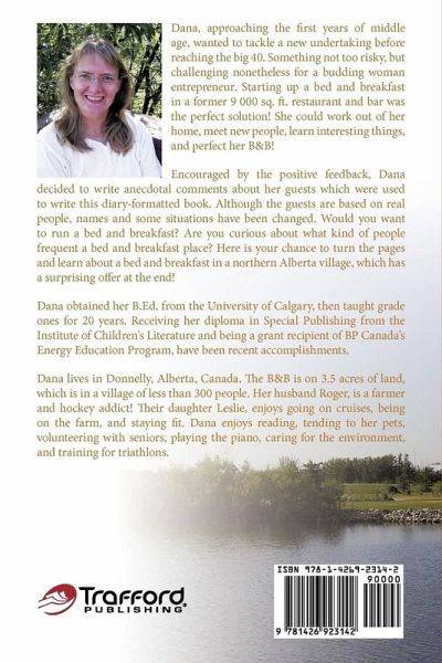 Dana, approaching the first years of middle age, wanted to tackle a new undertaking before reaching the big 40. Something not too risky, but challenging nonetheless for a budding woman entrepreneur. Starting up a bed and breakfast in a former 9 000 sq. ft. restaurant and bar was the perfect solution! She could work out of her home, meet new people, learn interesting things, and perfect her B&B! Encouraged by the positive feedback, Dana decided to write anecdotal comments about her guests which were used to write this diary-formatted book. Although the guests are based on real people, names and some situations have been changed. Would you want to run a bed and breakfast? Are you curious about what kind of people frequent such a place? Here is your chance to turn the pages and learn about a B&B in a northern Alberta village, which has a surprising offer at the end!