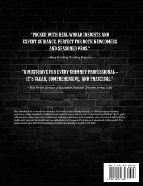 This Handbook is an essential resource for those in the chimney industry. It offers insights into best practices, safety standards, maintenance, inspection procedures, and professional guidelines. It is a go-to reference for inspectors, and technicians seeking to enhance their expertise, stay compliant with industry codes, and provide top-quality service. Whether you're new to the trade or a seasoned professional, this guide equips you with the knowledge and skills necessary to excel in the field. "Packed with real-world insights and expert guidance. Perfect for both newcomers and seasoned pros." -Gary Smalling, Smalling Masonry "A must-have for every chimney professional. It's clear, comprehensive, and practical." -Bob Ferrari, NCSG Education Director