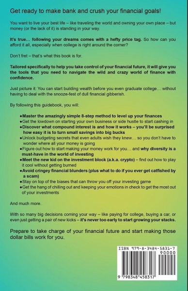 Get ready to make bank and crush your financial goals!Are you itching for independence, but still feel stuck relying on your parents for cash?Are you overwhelmed by the complex world of investing, with no idea where to start?Are you dreaming of a future where you can pursue your passions but worry you won't have the financial resources to make it happen?These concerns are totally legit. Basically, you want to live your best life - like traveling the world and owning your own place - but money (or the lack of it) is standing in your way.It's true... following your dreams comes with a hefty price tag. So how can you afford it all, especially when college is right around the corner? How can you make your dreams a reality without ending up broke?Don't fret - that's what this book is for.Tailored specifically to help you take control of your financial future, it will give you the tools that you need to navigate the wild and crazy world of finance with confidence. Just picture it: You can start building wealth before you even graduate college... without having to deal with the snooze-fest of dull financial gibberish.By following this guidebook, you will: * Master the amazingly simple 8-step method to level up your finances * Get the lowdown on starting your own business or side hustle to start cashing in (on your own terms!) * Discover what compound interest is and how it works - you'll be surprised at how easy it is to turn small savings into big bucks * Unlock budgeting secrets that even adults wish they knew... so you don't have to wonder where all your money is going * Figure out how to start making your money work for you... and why diversity is a must-have in the world of investing * Meet the new kid on the investment block (a.k.a. crypto) - find out how to play it cool without getting burned * Avoid cringey financial blunders (plus what to do if you ever get catfished by a scam) * Stay on top of the biases that can throw you off your investing game * Get the hang of chilling out and keeping your emotions in check to get the most out of your investments And much more.If you think finances are something you can worry about later... think again!With so many big decisions coming your way - like paying for college, buying a car, or even just getting a pair of new kicks - it's never too early to start growing your stacks.If you're ready to take charge of your financial future and start making those dollar bills work for you, then scroll up and click "Add to Cart" right now.
