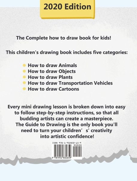 2020 Edition The Complete how to draw book for kids! This children's drawing book includes five categories¿ Animals Objects Plants Transportation Cartoon Every mini drawing lesson is broken down into easy to follow step by step instructions, so that all budding artists can create a masterpiece. The Guide to Drawing is the only book you'll need to turn your kids' creativity into artistic confidence! Drawing makes children happier all their lives