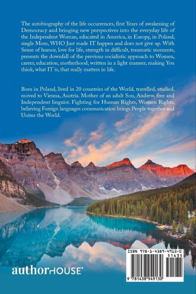 The autobiography of the life occurrences, first Years of awakening of Democracy and bringing new perspectives into the everyday life of the Independent Woman, educated in America, in Europ, in Poland, single Mom, WHO Just made IT happen and does not give up. With Sense of humor, love for life, strength in difficult, traumatic moments, presents the downfall of the previous socialistic approach to Women, career, education, motherhood, written in a light manner, making You think, what IT is, that really matters in life.