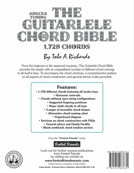 The Guitalele Chord Bible, with its 1,728 chords offers a complete solution for both beginner and experienced professional musician alike. The layout is uncomplicated and follows a logical musical progression from standard major chords up to the more esoteric thirteenths used by many jazz players. To accompany the 1,728 chords, a further 576 possible moveable chord configurations are included, together with a useful range of slash chords, reflecting the popularity of this type of chord in many of today's artist and compilation topline songbooks. This highly comprehensive guide provides the musician with no fewer than 68 different types of chord in all twelve keys, making it the definitive publication for the Guitalele. Whether you play folk, rock, pop, jazz or any other type of popular music, The Guitalele Chord Bible makes the ideal reference source for all occasions. Standard Chords covered in The Guitalele Chord Bible (using the key of C as an example): C, Cm, C7, Cm7, C5, C6, Cm6, Cmaj7, Cdim, Cdim7, C-5, C+, Csus2, Csus4, C7sus4, Cm7-5, Cadd9, Cmadd9, C6add9, Cm6add9, C7-5, C7+5, C7-9, C7+9, Cm(maj7), Cmaj7-5, Cmaj7+5, C9, Cm9, Cmaj9, C11, C13. Advanced Chords covered in The Guitalele Chord Bible (using the key of C as an example): C4, Cadd11, Csus4add9, Cm-6, C7sus2, C7-5-9, C7-5+9, C7+5-9, C7+5+9, C7add11, C7add13, C7+11, Cm7-5-9, Cm7-9, Cm7add11, Cmaj7+11, C9sus4, C9-5, C9+5, C9+11, Cm9-5, Cm(maj9), Cmaj9-5, Cmaj9+5, Cmaj9+11, Cmaj9add6, C11-9, Cm11, Cmaj11, C13sus4, C13-5-9, C13-9, C13+9, C13+11, Cm13, Cmaj13. Major Slash Chords covered in The Guitalele Chord Bible (using the key of C as an example): C/C, C/Db, C/D, C/Eb, C/E, C/F, C/F#, C/G, C/Ab, C/A, C/Bb, C/B. Beside the many pages of chord boxes or windows, the book features useful sections on tuning, chord construction, fingerboard layout, FAQs, alternative chord naming, fingering, slash chords, harmonic intervals, chord window blanks for transcribing your own favorite chord sequences etc. Review of features: 1,728 Chords featuring all 12 keys 144 Major slash chords in all keys 576 possible moveable chord positions Standard ADGCEA tuning Chord theory, FAQs and tuning guides Fingerboard diagrams Guitar family factfile Alternative chord naming chart Blank chord windows for your own jottings and arrangements The aim of this guide is to provide the musician with the flexibility only really offered to guitar and keyboard players in the past. Now, with the help of The Guitalele Chord Bible, musicians will be able to pick up any songbook and instantly have access to even the most complex and advanced chords.