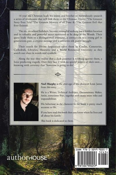 14 year old Christian leads his sisters and brother to meticulously unearth a series of revelations that will link them to the Ultimate Trinity; *The Greatest Story Ever Told *The Greatest Mystery of all Time & *The Greatest Evil that Ever Existed. The six, on school holidays, become entangled seeking out a hidden location and its valuable and powerful secret rumoured to be deep in the Woods. Their quest leads them to a distinguished aristocrat, a connection to a young girl in generations past, a cryptic message and a centuries old power struggle. Their search for Divine Inspiration takes them to Castles, Cemeteries, Cathedrals, Libraries, Museums and a World Renowned University as they search out clues in words and symbols. Along the way they realise that a dark presence is working against them, a force predicting tragedy. Dare they face it with no special powers of their own... knowing with certainty that 'Someone is going to die'.