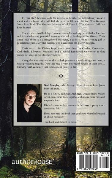 14 year old Christian leads his sisters and brother to meticulously unearth a series of revelations that will link them to the Ultimate Trinity; *The Greatest Story Ever Told *The Greatest Mystery of all Time & *The Greatest Evil that Ever Existed. The six, on school holidays, become entangled seeking out a hidden location and its valuable and powerful secret rumoured to be deep in the Woods. Their quest leads them to a distinguished aristocrat, a connection to a young girl in generations past, a cryptic message and a centuries old power struggle. Their search for Divine Inspiration takes them to Castles, Cemeteries, Cathedrals, Libraries, Museums and a World Renowned University as they search out clues in words and symbols. Along the way they realise that a dark presence is working against them, a force predicting tragedy. Dare they face it with no special powers of their own... knowing with certainty that 'Someone is going to die'.