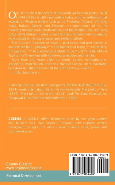 One of the most important of the medieval Persian poets, SA'DI (1194-1292) is still read widely today, with an influence that extends to Western writers such as La Fontaine, Diderot, Voltaire, Hugo, Balzac, Goethe, and Emerson. He spent much of his life traveling through Asia, North Africa, and the Middle East, returning to his native Shiraz (in what is now Iran) as an elderly man to compose works based on his experiences and wisdom gained. The Gulistan ("garden of roses"), part prose and part poetry, is divided into four "gateways" ("The Manners of Kings," "Concerning Darweeshes," "The Excellency of Moderation," and "The Benefits of Taciturnity") teeming with humorous anecdotes and insight. More than 700 years after his death, Sa'di's ruminations on leadership, materialism, and the virtues of silence-here translated by Edwin Arnold at the turn of the 20th century-live on in this classic work. British journalist, translator, and poet SIR EDWIN ARNOLD (1832-1904) often about Asia. His works include The Light of Asia (1879), The Light of the World (1901), and The Song Celestial, or, Bhagavad-Gita (from the Mahabharata) (1885).