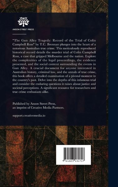 "The Gun Alley Tragedy: Record of the Trial of Colin Campbell Ross" by T.C. Brennan plunges into the heart of a notorious Australian true crime. This meticulously reproduced historical record details the murder trial of Colin Campbell Ross, a case that gripped Melbourne and the nation. Explore the complexities of the legal proceedings, the evidence presented, and the social context surrounding the events in Gun Alley. A crucial document for anyone interested in Australian history, criminal law, and the annals of true crime, this book offers a detailed examination of a pivotal moment in the country's past. Delve into the depths of this infamous trial and consider the enduring questions it raises about justice and societal perceptions. A significant resource for researchers and true crime enthusiasts alike. This work has been selected by scholars as being culturally important, and is part of the knowledge base of civilization as we know it. This work is in the public domain in the United States of America, and possibly other nations. Within the United States, you may freely copy and distribute this work, as no entity (individual or corporate) has a copyright on the body of the work. Scholars believe, and we concur, that this work is important enough to be preserved, reproduced, and made generally available to the public. We appreciate your support of the preservation process, and thank you for being an important part of keeping this knowledge alive and relevant.
