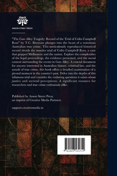 "The Gun Alley Tragedy: Record of the Trial of Colin Campbell Ross" by T.C. Brennan plunges into the heart of a notorious Australian true crime. This meticulously reproduced historical record details the murder trial of Colin Campbell Ross, a case that gripped Melbourne and the nation. Explore the complexities of the legal proceedings, the evidence presented, and the social context surrounding the events in Gun Alley. A crucial document for anyone interested in Australian history, criminal law, and the annals of true crime, this book offers a detailed examination of a pivotal moment in the country's past. Delve into the depths of this infamous trial and consider the enduring questions it raises about justice and societal perceptions. A significant resource for researchers and true crime enthusiasts alike. This work has been selected by scholars as being culturally important, and is part of the knowledge base of civilization as we know it. This work is in the public domain in the United States of America, and possibly other nations. Within the United States, you may freely copy and distribute this work, as no entity (individual or corporate) has a copyright on the body of the work. Scholars believe, and we concur, that this work is important enough to be preserved, reproduced, and made generally available to the public. We appreciate your support of the preservation process, and thank you for being an important part of keeping this knowledge alive and relevant.