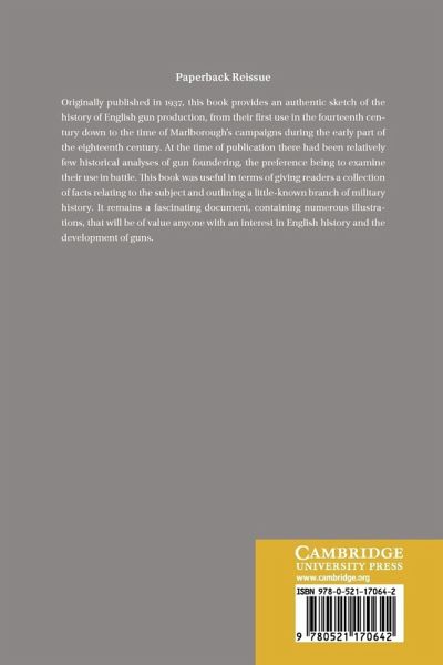 Originally published in 1937, this book provides an authentic sketch of the history of English gun production, from their first use in the fourteenth century down to the time of Marlborough's campaigns during the early part of the eighteenth century. At the time of publication there had been relatively few historical analyses of gun foundering, the preference being to examine their use in battle. This book was useful in terms of giving readers a collection of facts relating to the subject and outlining a little-known branch of military history. It remains a fascinating document, containing numerous illustrations, that will be of value anyone with an interest in English history and the development of guns.