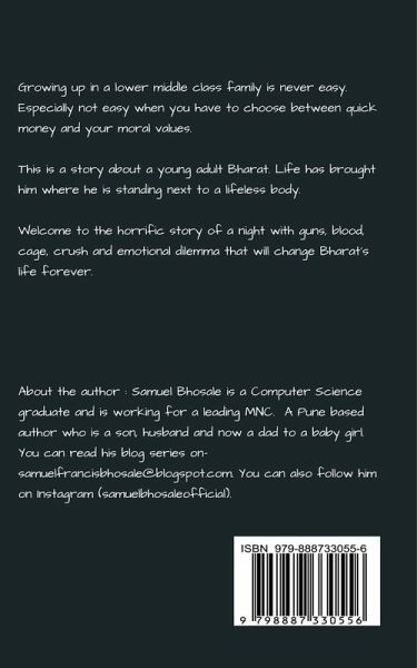Growing up in a lower middle class family is never easy. Especially when you have to choose between quick money and your moral values. This story is about a young adult Bharat. Life has brought him where he is standing next to a lifeless body. Welcome to the horrific story of a night with guns, blood, cage, crush, and emotional dilemma that will change Bharat's life forever.