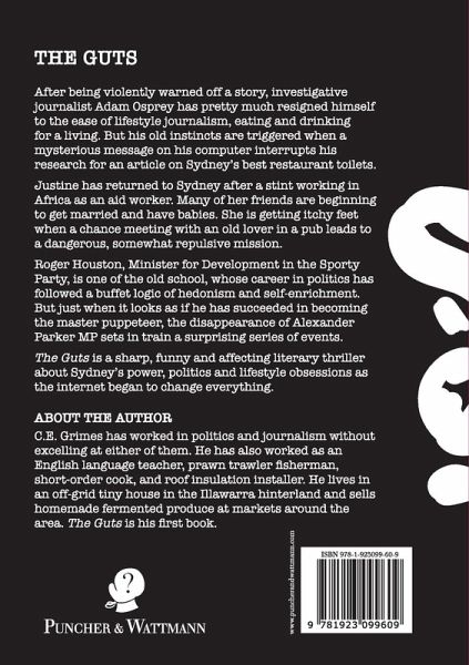 After being violently warned off a story, investigative journalist Adam Osprey has pretty much resigned himself to the ease of lifestyle journalism, eating and drinking for a living. But his old instincts are triggered when a mysterious message on his computer interrupts his research for an article on Sydney's best restaurant toilets. Justine has returned to Sydney after a stint working in Africa as an aid worker. Many of her friends are beginning to get married and have babies. She is getting itchy feet when a chance meeting with an old lover in a pub leads to a dangerous, somewhat repulsive mission. Roger Houston, Minister for Development in the Sporty Party, is one of the old school, whose career in politics has followed a buffet logic of hedonism and self-enrichment. But just when it looks as if he has succeeded in becoming the master puppeteer, the disappearance of Alexander Parker MP sets in train aa surprising series of events. The Guts is a sharp, funny and affecting literary thriller about Sydney's power, politics and lifestyle obsessions as the internet began to change everything.