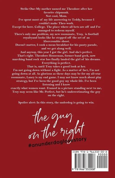 "I've never laughed out loud so many times while reading just to turn around and melt into a puddle of swoon juice from all the steamy sweetness Kate packed in between the brilliant sight gags and hilarious banter in this book. It might just be the best $3.99 I've ever spent." -B.B. Easton, author of 44 Chapters About 4 Men An Amazon TOP 30 Bestseller! Strike One-My mother named me Theodore after her favorite chipmunk. Not cool, Mom. I've spent most of my life answering to Teddy, because I couldn't make Theo work. Except for here. College. The place where all bets are off, and I've managed to redeem myself. There's only one problem, my new roommate, Troy, is football royalty and looks like he stepped off the set of an Abercrombie shoot. Doesn't matter, I cook a mean breakfast for his panty parade, and we get along well. And anyway, this year I got the girl. And she's perfect. That's right. Theodore Houseman, former band geek, now marching band rock star has finally landed the girl of his dreams. Everything is perfect. That is, until Troy takes a good look at her. I'm not going down without a fight. As a matter of fact, I'm not going down at all. As glorious as these days may be for my all-star roommate, Laney is my end game. I may not know much about play strategy, but I've been the good guy my whole life. I've been listening and I know exactly what women want. Framed in a picture standing next to me, Troy may seem like Mr. Perfect, but he's underestimating the guy on the right. Spoiler alert: In this story, the underdog is going to win. The Underdogs Series Reading order #1 The Guy on the Right #2 The Guy on the Left #3 The Guy in the Middle *Though all books in The Underdogs Series can be read as stand-alone novels, it's highly suggested you read them in order as all three stories interconnect, and book three has a extended series epilogue.
