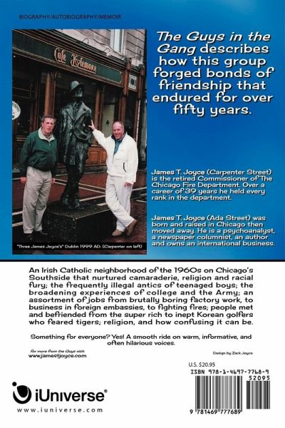 There was more to be learned on Chicago's Southside than the reading, writing, and religion taught in schools. In this memoir, authors James T. Joyce and James T. Joyce present a collection of stories about what they learned growing up in an Irish-Catholic neighborhood in the 1950s and '60s on Chicago's Southside. The Guys in the Gang narrates how the neighborhood nurtured love, camaraderie, family values, and racial hatred. It tells of how religion shaped their lives; describes the frequently illegal (but mostly harmless) antics of teenaged boys; discusses the broadening experiences of college and the army; and recalls an assortment of jobs, from the brutally boring and noisy factory work to business in foreign embassies to fighting fires. It tells of people met and befriended, from the super-rich to inept Korean golfers who feared imaginary tigers, including poignant and entertaining snippets from their lives. With humorous touches, The Guys in the Gang describes how this group forged bonds of friendship that endured monkeys and mortal losses, and how the guys supported each other through high times and dark valleys.