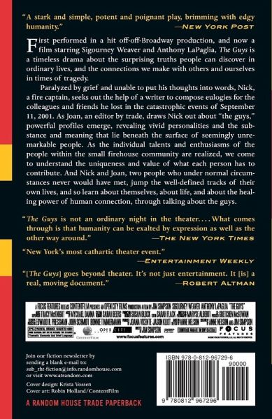 First performed in a hit off-off-Broadway production, and soon to be a film starring Sigourney Weaver and Anthony LaPaglia, The Guys is a timeless drama about the surprising truths people can discover in ordinary lives, and the connections we make with others and ourselves in times of tragedy. Paralyzed by grief and unable to put his thoughts into words, Nick, a fire captain, seeks out the help of a writer to compose eulogies for the colleagues and friends he lost in the catastrophic events of September 11, 2001. As Joan, an editor by trade, draws Nick out about "the guys,” powerful profiles emerge, revealing vivid personalities and the substance and meaning that lie beneath the surface of seemingly unremarkable people. As the individual talents and enthusiasms of the people within the small firehouse community are realized, we come to understand the uniqueness and value of what each person has to contribute. And Nick and Joan, two people who under normal circumstances never would have met, jump the well-defined tracks of their own lives, and so learn about themselves, about life, and about the healing power of human connection, through talking about the guys.