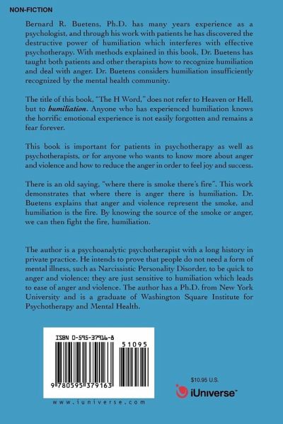 Bernard R. Buetens Ph.D., has over 30 years experience as a psychologist and through his work with patients he has discovered the destructive power of humiliation, which interferes with effective psychotherapy. With methods explained in this book, Dr. Buetens has taught both patients and other therapists how to recognize humiliation and deal with anger. Dr. Buetens considers humiliation insufficiently recognized by the mental health community. The title of this book, "The H Word" does not refer to Hell, but rather to humiliation. Anyone who experienced humiliation knows the horrific emotional experience which is not easily forgotten and remains a fear forever. This book is for anyone who wants to know more about anger and violence, and how to reduce the in order to feel joy and success. There is an old saying, "where there is smoke there's fire." This work will demonstrate where there is anger there is humiliation. Dr. Buetens knows how anger and violence represent the smoke, and humiliation is the fire. By knowing the source of the smoke or anger, we can then fight the fire, humiliation.