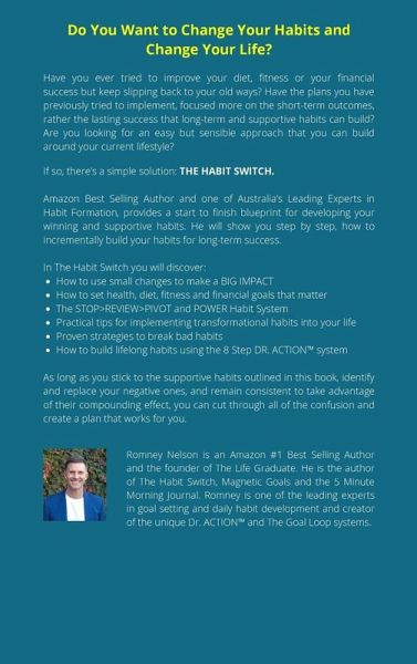 Establish Supportive Habits For Long-Term Success Through Incremental Habit DevelopmentHave you ever tried to improve your diet, fitness or your financial success but keep slipping back to your old ways? Have the plans you have previously tried to implement focused more on the short-term outcomes, rather than the lasting success that long-term and supportive habits can build? Are you looking for an easy but sensible approach that you can build around your current lifestyle? If so, there's a simple solution: THE HABIT SWITCH Amazon Best Selling Author and one of Australia's Leading Experts in Habit Formation Romney Nelson, provides the start to finish blueprint for developing your winning and supportive habits. In the Habit Switch, Romney will show you step by step, how to incrementally build your habits for long-term success In The Habit Switch you will discover: How to use small changes to make a BIG IMPACT How to set health, diet, fitness and financial goals that matter The STOP>REVIEW>PIVOT and POWER system for reviewing your current progress Practical tips for implementing transformational habits into your life Proven strategies to break bad habits and implement daily supportive actions How to build lifelong and supportive habits using the 8 Step DR. ACTION system As long as you stick to the supportive habits outlined in this book, identify and replace your negative ones, and remain consistent to take advantage of their compounding effect, you can create a long-term success plan that works for you. Make the decision to start TODAY by taking ACTION. You won't regret it!