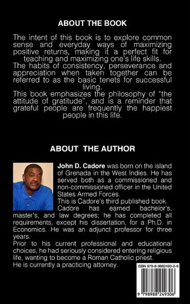 The intent of this book is to explore common sense and everyday ways of maximizing positive returns, making it a perfect fit for teaching and maximizing one's life skills. The habits of consistency, perseverance and appreciation when taken together can be referred to as the basic tenets for successful living. This book emphasizes the philosophy of "the attitude of gratitude" , and is a reminder that grateful people are frequently the happiest people in this life.